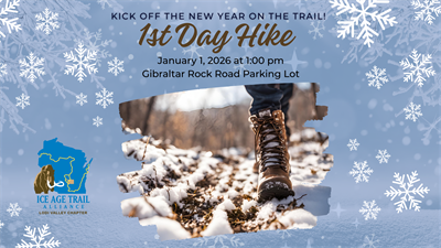Join the Lodi Valley Chapter of the Ice Age Trail as we continue our annual tradition of welcoming the New Year with a refreshing First Day Hike. We will have hot chocolate and some leftover cookies (maybe even some fruitcake...yum) to toast in the New Year!