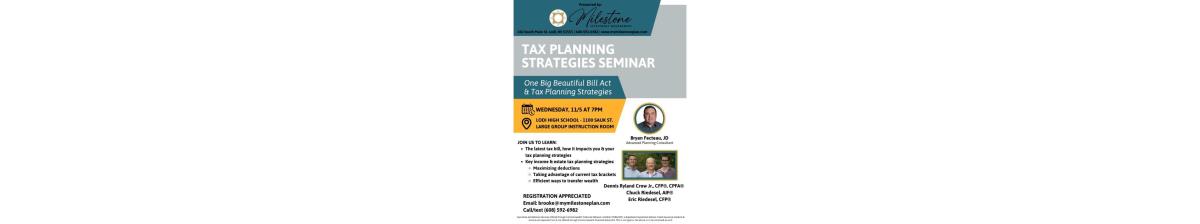 Join the Milestone Team and Advanced Planning Consultant Bryan Fecteau on Tuesday, November 5 at 7 PM at Lodi High School (Large Group Instruction Room near the gym) for an informative seminar on the One Big Beautiful Bill Act and Tax Planning Strategies. The informational flyer is here.